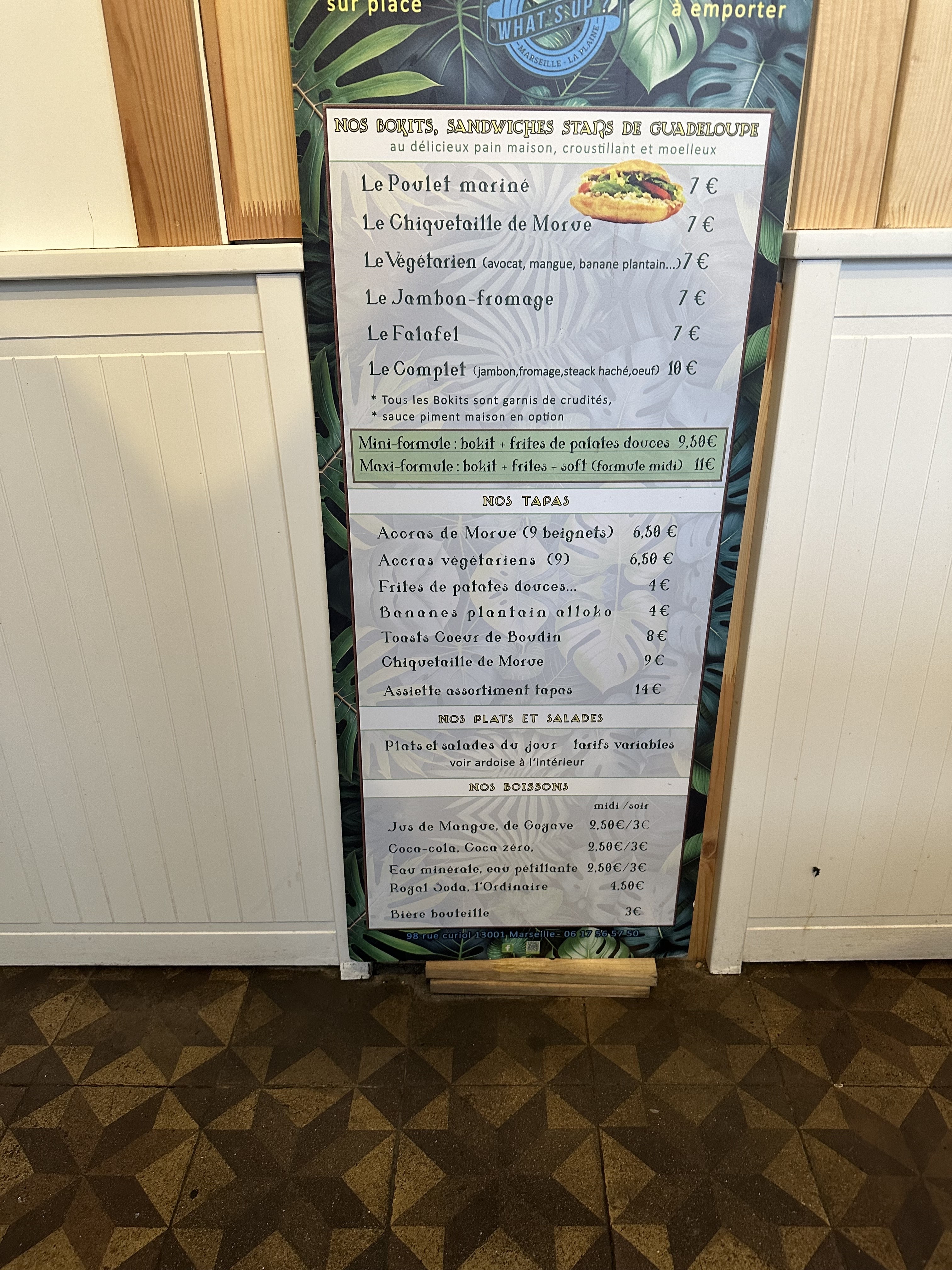 Posté le 20/05/2019 à 14:35"Les Bokits sont bons et très bien garnis, les sorbets coco et mangue également. La déco est sympa et le patron aussi! Seul petit bémol: il y avait beaucoup d'os et de morceaux de cartilages dans le poulet..."